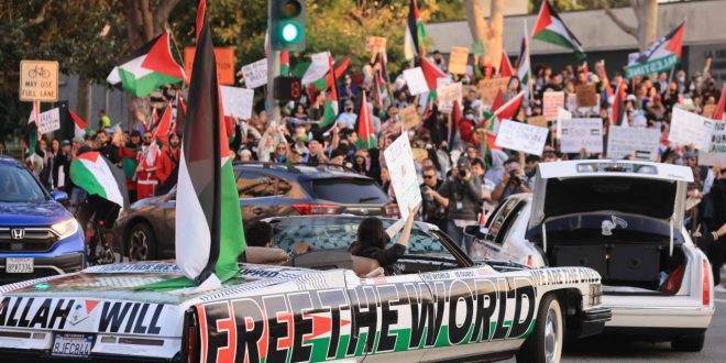 وشهدت عدة مئات من المتظاهرين المؤيدين للفلسطينيين يسيرون في الشوارع باتجاه مركز بيفرلي سنتر التجاري الشهير في وقت متأخر من يوم السبت، مع انتشار العشرات من مركبات شرطة لوس أنجلوس ووحدات الدراجات النارية في الشوارع وفي مواقف السيارات التجارية القريبة بينما كانت المجموعة تتقدم عبر الطريق المؤدي إلى مركز التسوق.