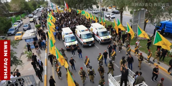 وفي الطرف الآخر، شهد شارع فلسطين في جانب الرصافة من العاصمة موكب تشييع لثلاثة مقاتلين من كتائب حزب الله قضوا بقصف في محافظة البصرة أمس الثلاثاء، حيث وثقت كاميرا وكالة، لحظات حزن ودموع المشيعين.