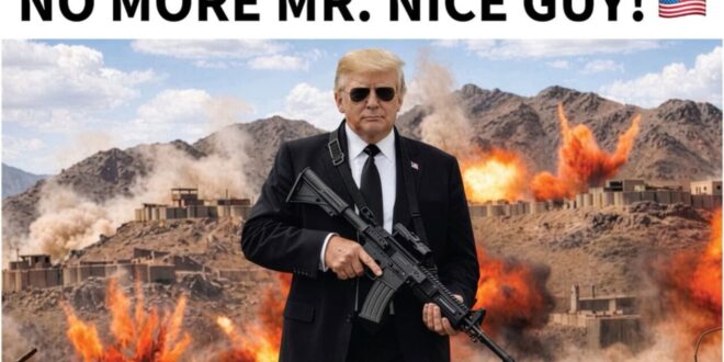 نشر الرئيس الأمريكي، دونالد ترامب، صورة مركبة له يحمل بندقية آلية متضمنة رسالة إلى إيران، فيما جاء توقيت نشرها لافتا إذ تم نشرها حوالي الساعة 4:30 بتوقيت واشنطن.