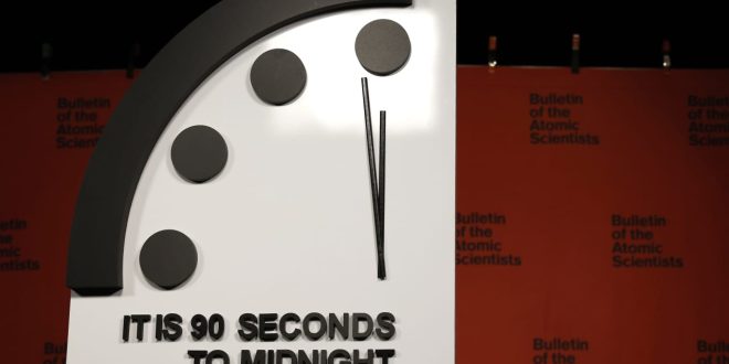 الثلاثاء، تم ضبط الساعة مرة أخرى عند 90 ثانية حتى منتصف الليل – الأقرب للساعة 12 على الإطلاق، وفقًا لنشرة علماء الذرة، التي أنشأت الساعة في عام 1947. ويمثل منتصف الليل اللحظة التي يكون الناس قد جعلوا فيها الأرض غير صالحة للسكن. في العام الماضي حددت النشرة الساعة بـ 90 ثانية حتى منتصف الليل ويرجع ذلك أساسًا إلى الغزو الروسي لأوكرانيا وزيادة خطر التصعيد النووي.