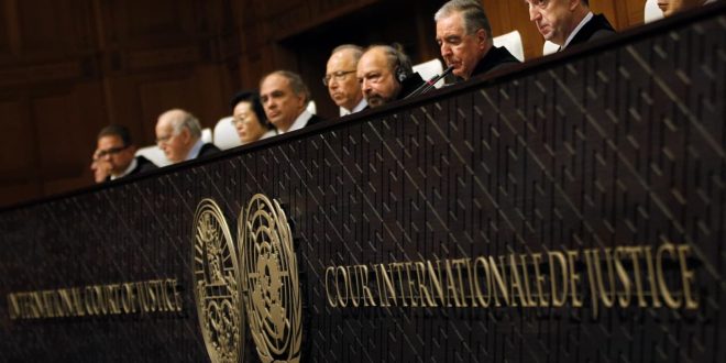 ويمكن للدول الأعضاء في الأمم المتحدة وتلك التي قبلت اختصاص محكمة العدل الدولية تقديم القضايا. تقبل المحكمة القضايا التي قبلت فيها كل من الدول المعنية اختصاصها القضائي. وتتألف محكمة العدل الدولية من 15 قاضياً يخدمون لمدة تسع سنوات. القضاة الحاليون هم من الولايات المتحدة وروسيا والصين وسلوفاكيا والمغرب ولبنان والهند وفرنسا والصومال وجامايكا واليابان وألمانيا وأستراليا وأوغندا والبرازيل. يتم طرح خمسة مقاعد للانتخابات كل ثلاث سنوات، مع عدم وجود حد لعدد الولايات المتتالية.