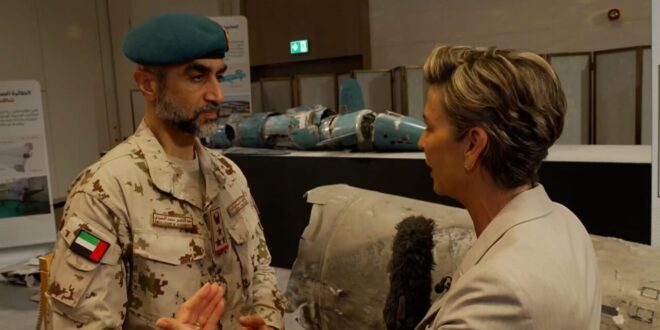 تتحدث الزميلة بيكي أندرسون، مذيعة شبكة في أبوظبي، مع اللواء الركن عبد الناصر الحميدي، المتحدث باسم وزارة الدفاع الإماراتية، الذي أطلعنا على بعض حطام الصواريخ والطائرات المسيّرة الإيرانية التي تم اعتراضها بواسطة أنظمة الدفاع الجوي والمقاتلات الإماراتية.