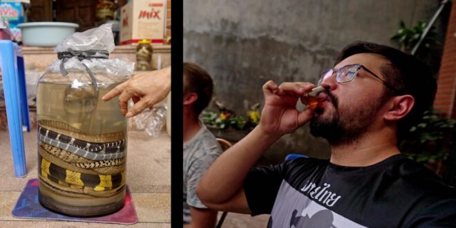 — نبيذ الثعابين الذي يُعتبر تجربة غير مألوفة، يُعد مثالًا على التجارب التي يسعى محبو السفر إلى خوضها.