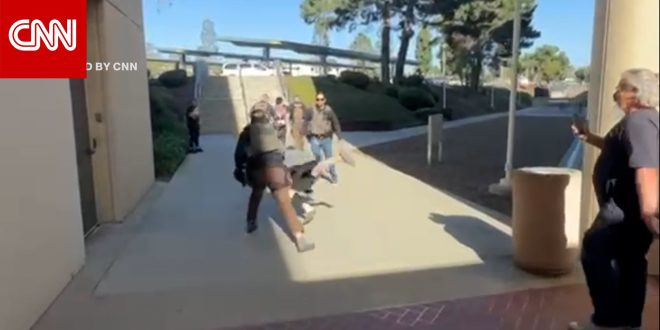 حصلت شبكة الوكالة على مقطع فيديو يظهر فيه ضابط من إدارة الهجرة والجمارك (ICE) وهو يطرح امرأة أرضاً ثم يرش مجموعة من المتطوعين المدافعين عن حقوق المهاجرين برذاذ الفلفل خارج مبنى حكومي في ولاية كاليفورنيا الأمريكية.