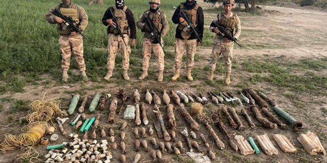 وأضافت، أن “الكدس احتوى على (قنابر هاون ٦٠ ملم عدد (٢٧) تالف، قنابر هاون ٨٢ ملم عدد (٥) تالف، قنابر هاون ١٢٠ ملم عدد (١) تالفة، صاروخ قاذفة درع عدد (١٢) تالف، صاروخ قاذفة اشخاص عدد (٥) تالف، حشوات صاروخ قاذفة عدد (٢٠) تالفة، قاذفة تالفة سبطانة BKC عدد (٢) تالفة، فتيل أمان عدد (٣ بكره) طول ٢٠٠ م تالف، مصدر طاقة (بطاريات) عدد (٦٤) تالفة”.