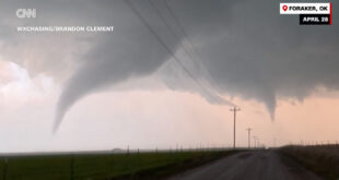 شُوهد إعصاران متزامنان في منطقة ريفية قرب فوركر، بولاية أوكلاهوما الأمريكية، في ظلّ احتمال هبوب عواصف شديدة تهدد أجزاءً من الغرب الأوسط الأمريكي. قد يهمك أيضًا.. لحظة مرعبة.. رجل يوثّق…
